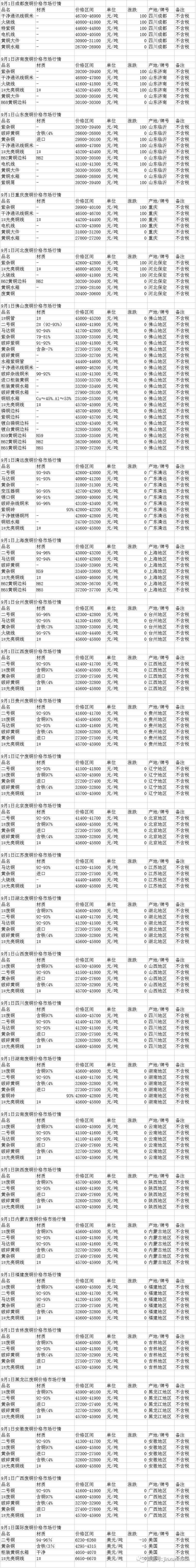 图为9月1日中国废铜价格。具体价格请见表格。