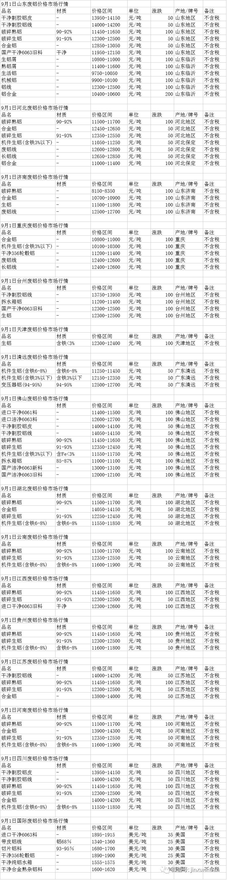 图为9月1日中国废铝价格。具体价格请见表格。